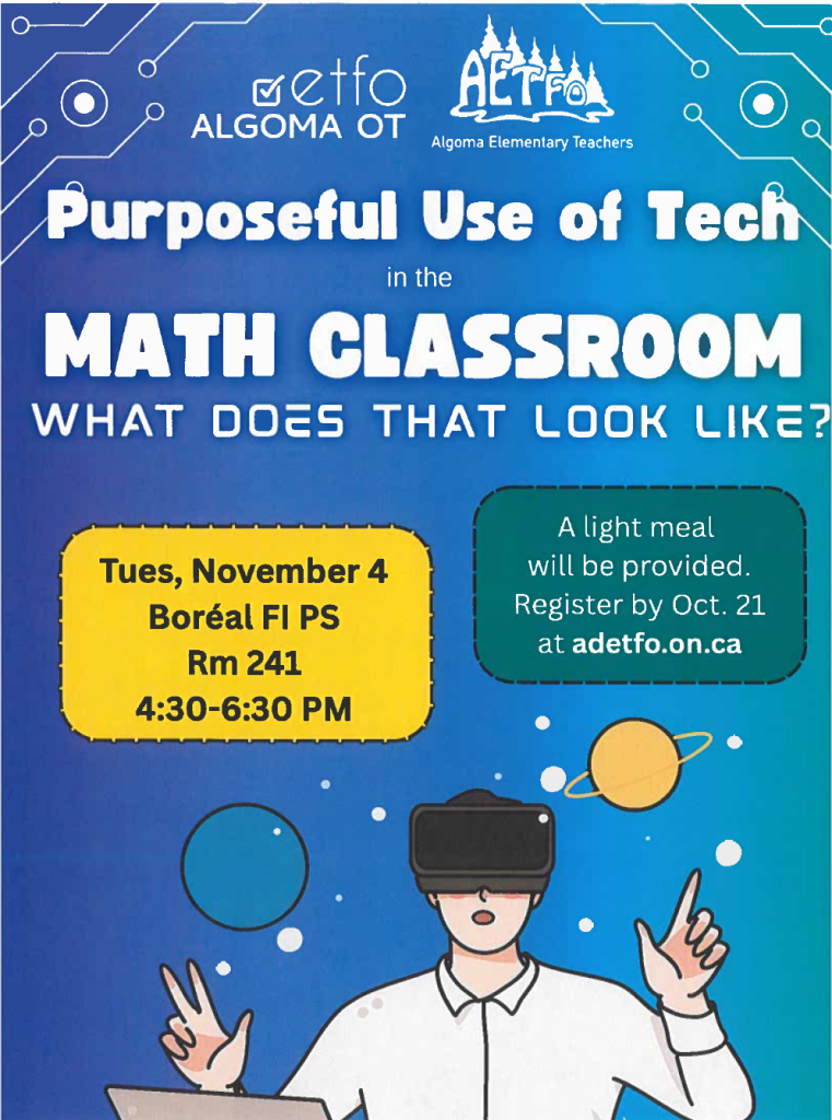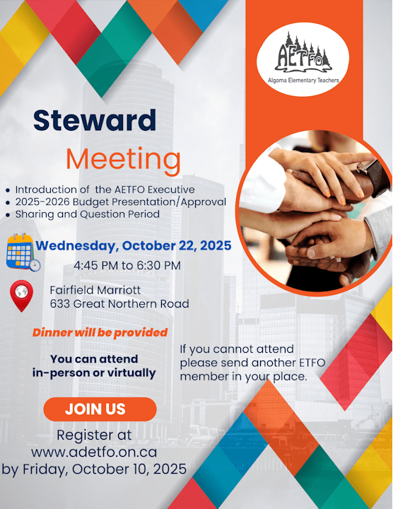 Introduction of AETFO Executive, 2025-2026 Budget Presentation and Approval, Sharing and Question Period. YOU CAN ATTEND IN-PERSON OR VIRTUALLY. If you cannot attend, please send another ETFO member in your place. Fairfield Marriott, 633 Great Northern Road. Dinner provided. Registration deadline: Friday, October 10, 2025.